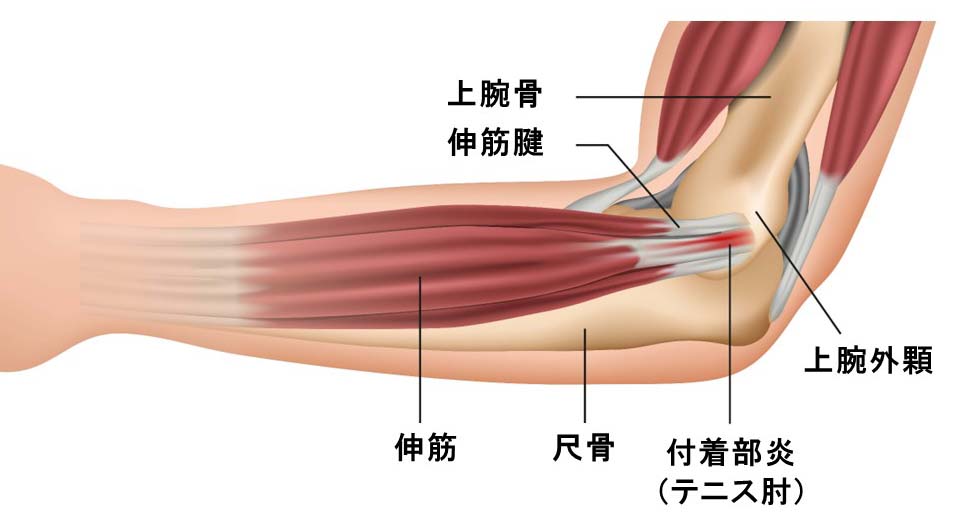ここに筋力のストレスが集中するために痛むのがテニス肘で、正式な病名は上腕骨外側上顆炎(略して上腕外顆炎)といいます。テニス選手に多くみられることからこの名で呼ばれます。